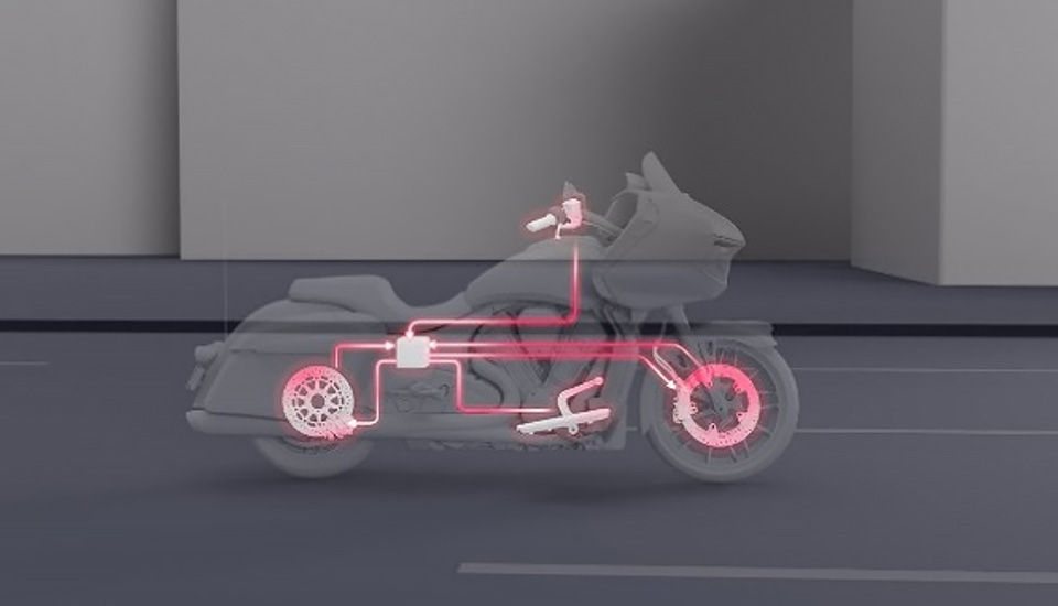 Le freinage combiné électronique est une fonction qui mesure l'action du conducteur sur les freins et les paramètres du véhicule pour calculer la répartition optimale de la force de freinage avant et arrière dans chaque situation de freinage. Par exemple, si seul le frein avant ou arrière est actionné, le système le reconnaît et applique automatiquement la force de freinage optimale aux freins avant et arrière. Cette fonction est intégrée à la technologie SmartLean d'Indian Motorcycle, de sorte qu'un freinage optimal soit appliqué à la fois en ligne droite et dans les virages.