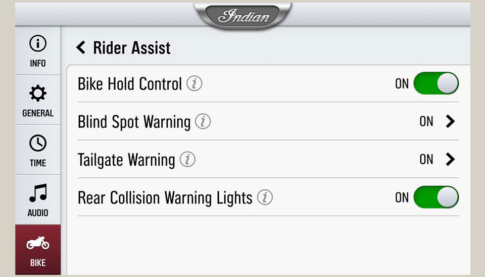 Le contrôle de l'immobilisation de la moto est un dispositif utilisé lorsque les motards sont à l'arrêt sur une pente ou un déclin. Le système fonctionne en appliquant une pression sur les freins pour empêcher la moto d'avancer ou reculer. Le contrôle de l'arrêt de la moto peut être activé en tirant fermement sur le levier de frein avant ou en appuyant fermement sur la pédale de frein arrière. Les notifications d'état pour savoir si le système Bike Hold Control est disponible et actif sont affichées sur l'écran 7 pouces alimenté par RIDE COMMAND. Le contrôle de l'arrêt de la moto fonctionne sur tous les rapports, y compris le point mort. L'immobilisation se désactive lorsque :